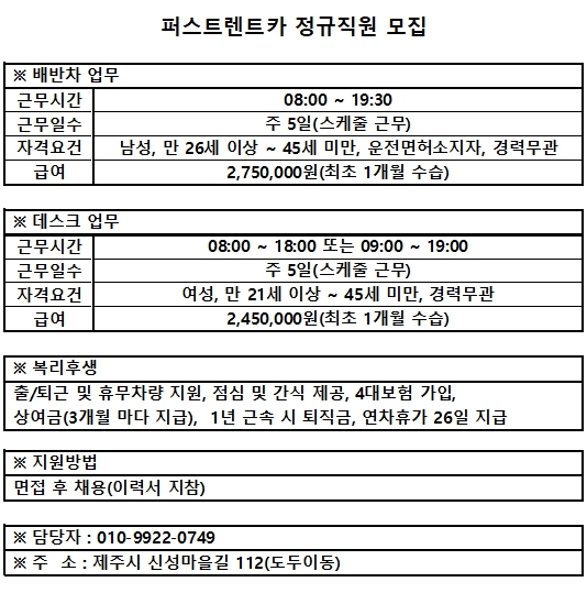 퍼스트렌트카_배반차_및_데스크_직원모집 페이지 정보 작성자 퍼OOz 작성일25-09-11 14:13 조회423회 연락처 010-9922-0749 급여 월급 : 275만원 관련링크 본문 연락바랍니다. 주소 : 제주특별자치도 제주시 신성마을길 112 1층 이전글 다음글 목록