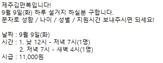 9월9일_하루_근무자_구인합니다 페이지 정보 작성자 제OOO복 작성일25-09-07 12:37 조회663회 연락처 010-5685-0355 급여 시급 : 11000 관련링크 본문 제주김만복 주소 : 제주특별자치도 제주시 오라로 41 제주김만복 본점 이전글 다음글 목록