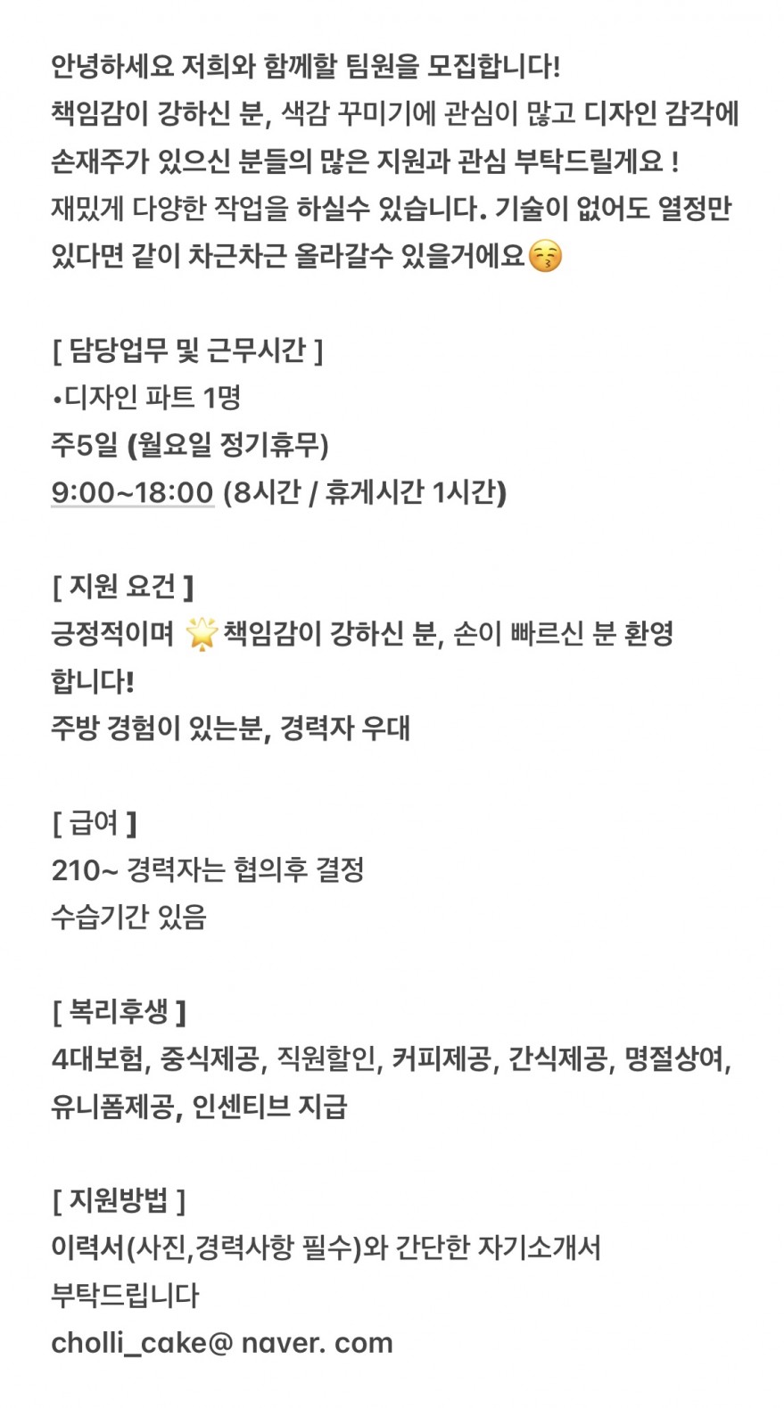 케이크 디자이너 모집합니다✨ 페이지 정보 작성자 cOOOOe 작성일24-11-17 11:24 조회3,453회 연락처 010-0-0 급여 월급 : 210~ 관련링크 본문 주소 : 제주특별자치도 제주시 신설로2길 5-4 이전글 다음글 목록