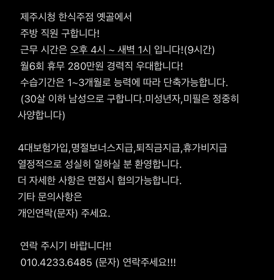 제주시청 한식주점 옛골에서 주방 직원 구합니다!! 페이지 정보 작성자 꼬동 작성일25-09-06 13:35 조회494회 연락처 010-4233-6485 급여 월급 : 2800000 관련링크 본문 문자 연락 부탁드립니다! 주소 : 제주시 광양8길 1-6 2층 옛골 이전글 다음글 목록