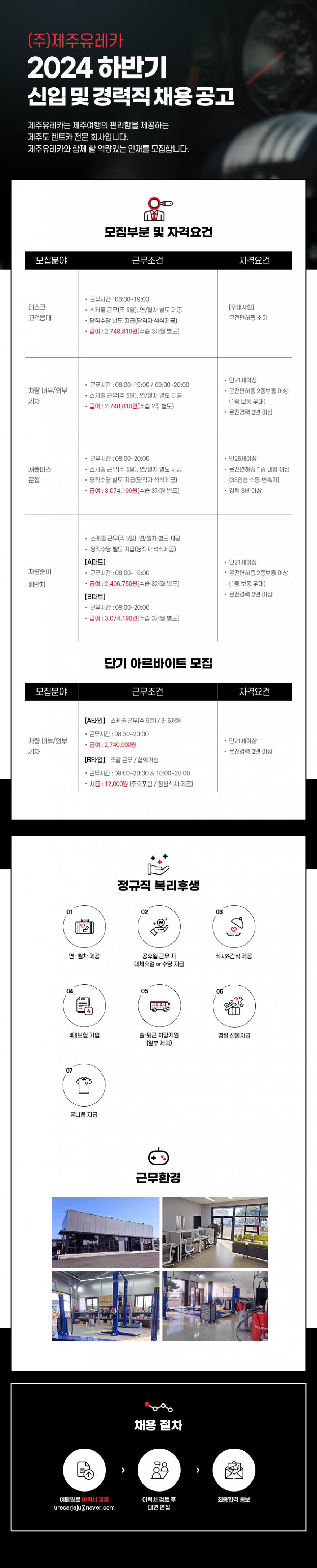 ★☆(주)제주유레카 렌터카/렌트카 구인- 데스크, 운영지원(배,반차), 세차파트 구인(평일,주말) 페이지 정보 작성자 제OOO카 작성일24-11-14 19:57 조회3,539회 연락처 010-9973-8018 급여 월급 : 3,074,190원 관련링크 본문 ※ 긴급연락처 : 010-9973-8018(문자주세요-지원파트기재) 주소 : 제주특별자치도 제주시 어영길 20 제주유레카 렌트카 이전글 다음글 목록