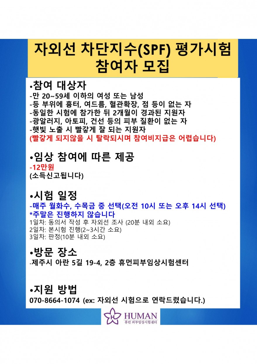 주소 : 제주특별자치도 제주시 아란5길 19-4 2층 휴먼피부임상시험센터