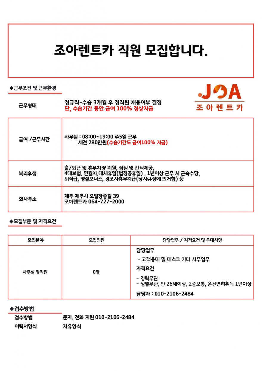 조아렌트카 직원모집합니다. 출퇴/휴무 차량 지원 페이지 정보 작성자 jOOOOOt 작성일24-11-13 12:51 조회3,478회 연락처 010-2106-2484 급여 월급 : 280만원 관련링크 본문 주소 : 제주특별자치도 제주시 오일장중길 39 조아렌트카 이전글 다음글 목록