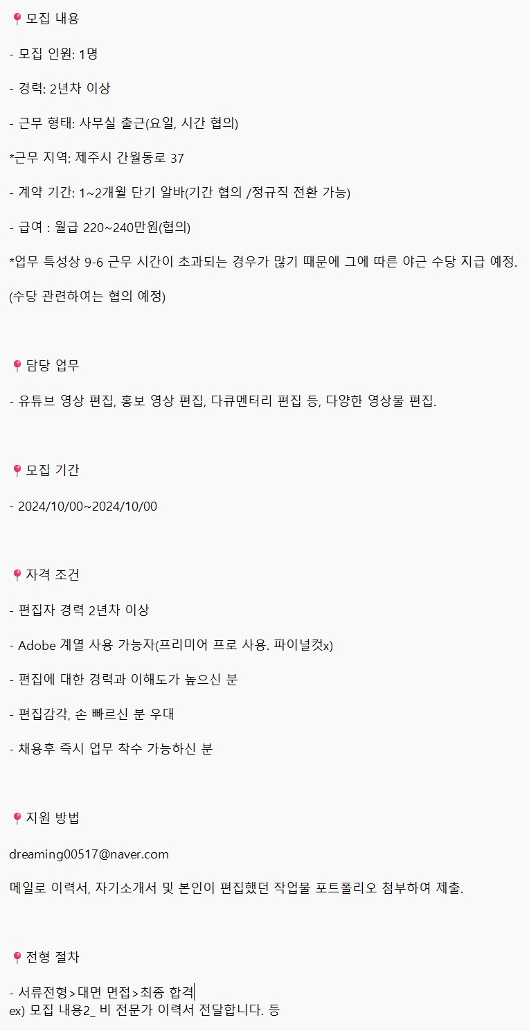 [급구]드림엔터테인먼트와 함께할 단기 및 장기 영상편집자를 모집합니다 페이지 정보 작성자 드O3 작성일24-10-27 14:58 조회3,748회 연락처 010-5679-7042 급여 월급 : 220~240만원(협의) 관련링크 본문 드림엔터테인먼트와 함께할 단기 및 장기 영상 편집자를 모집합니다. 최대한 빨리(11월즈음부터) 업무 착수 가능한 편집자분 찾고 있습니다! 많은 지원바랍니다 주소 : 제주특별자치도 제주시 간월동로 37 이전글 다음글 목록
