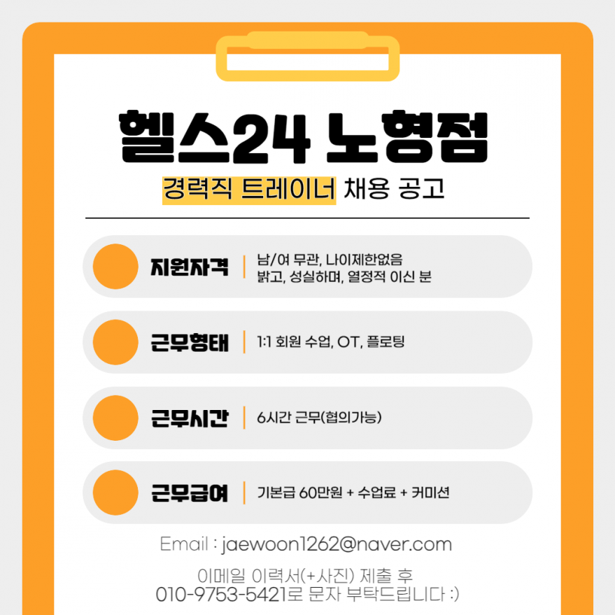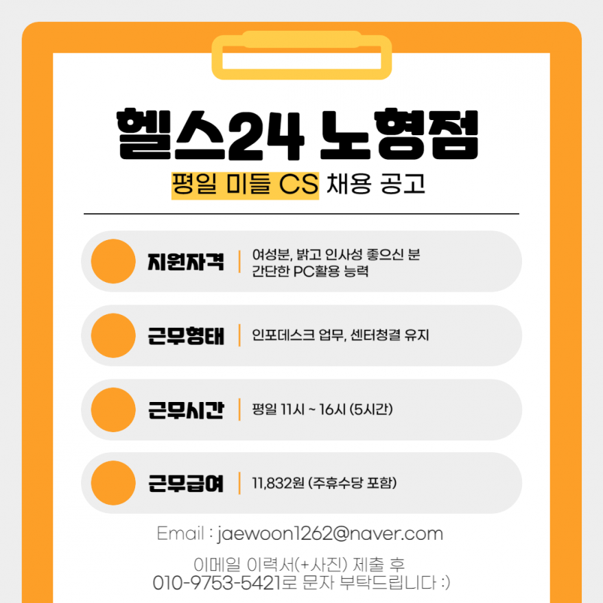 ♥♥♥재밌게 일 할 사람♥♥♥ 페이지 정보 작성자 헬OOOOOOO점 작성일24-10-25 17:50 조회3,419회 연락처 010-9753-5421 급여 협의 : 350만원 관련링크 본문 헬스24 노형점에서 즐겁게 일 할 사람 구해요!이력서 지원 후 문자 주시면 연락 드리겠습니다♥ 주소 : 제주특별자치도 제주시 연북로 54 이전글 다음글 목록