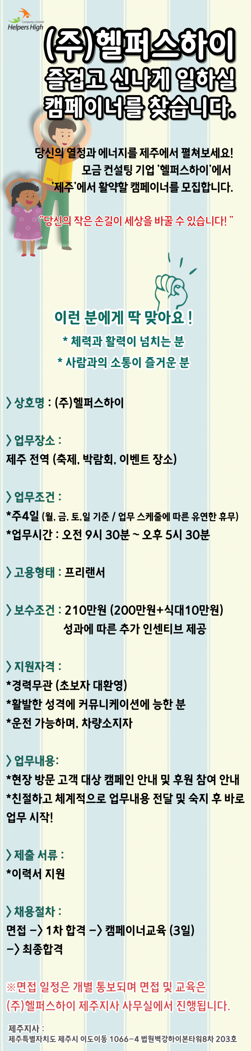 (주4일제) 제주 캠페이너 채용/ 즐겁고 신나게 일하실 분을 찾습니다 페이지 정보 작성자 hOOOOOOOOOh 작성일25-04-21 11:31 조회1,567회 연락처 010-2614-9020 급여 월급 : 210000 관련링크 본문 *지원 방법 0 10-2614-9020 (이름, 나이, 사는곳 작성하여 문자 지원 부탁드립니다.) 주소 : 제주특별자치도 제주시 이도이동 1066-4 이전글 다음글 목록