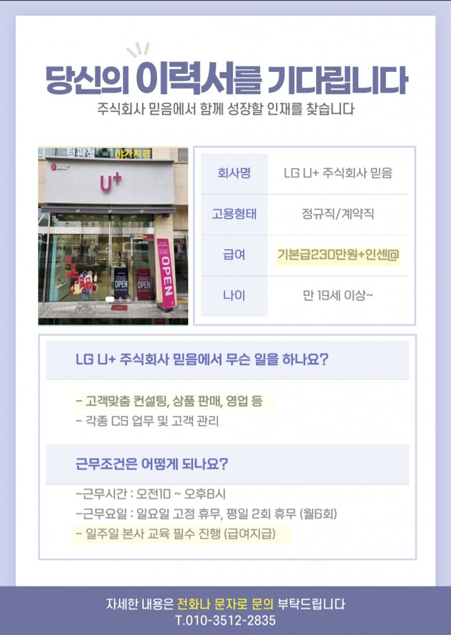 주식회사 믿음에서 함께성장할 인재를 찾습니다. 저 입사한지 4개월 차인데 700법니다 못해도 400 이상 쌉가능 얼른 오세요~ 젊고 유능하신 대표님과 젊고 밝은 분위기의 회사에서 함께해요~ 가족같은 분위기, 유망한 직장입니다!! 믿음 최고!!