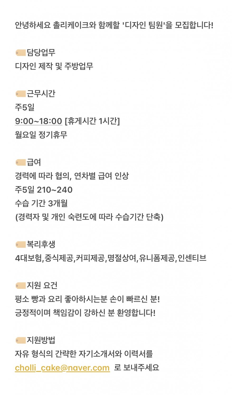 -`♥´-케이크 디자인 팀원을 모집합니다-`♥´- 페이지 정보 작성자 cOOOOe 작성일24-08-23 20:48 조회3,340회 연락처 010-0000-0000 급여 월급 : 210~240 관련링크 본문 저희 촐리케이크는 시즌별 다양한 작업을 합니다.긍정적이고, 건강한 마인드로 함께 손발을 맞춰가실 분을 찾습니다! 열정을 가지고 저희와 함께 가게를 키워나갈 많은 분들의 지원 기다리고 있겠습니다 주소 : 제주특별자치도 제주시 신설로2길 5-4 이전글 다음글 목록