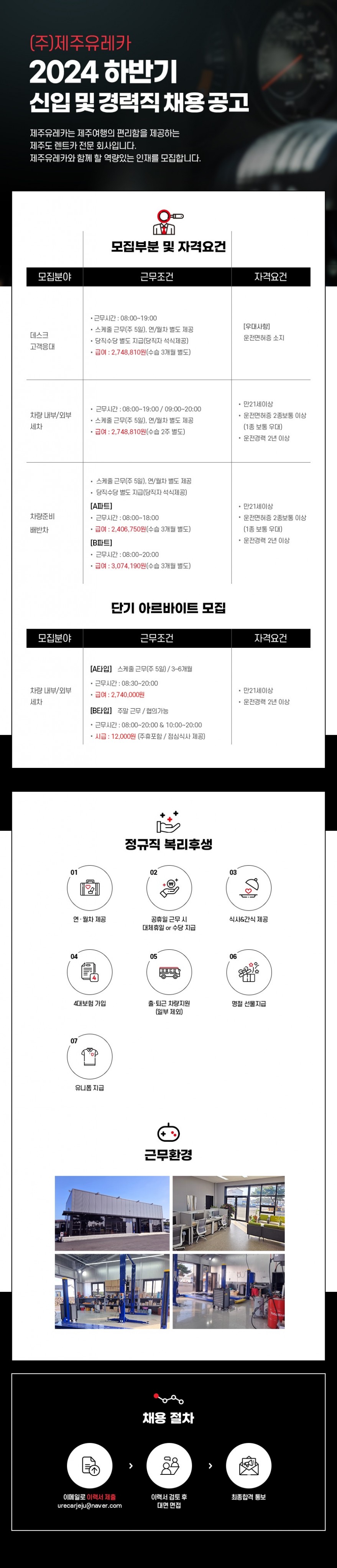 ★☆(주)제주유레카 렌터카 구인- 셔틀직원 및 세차파트 구인 페이지 정보 작성자 유O카 작성일24-10-23 13:10 조회3,793회 연락처 010-9973-8018 급여 월급 : 3,074,190원 관련링크 본문 긴급연락처 : 010-9973-8018(문자주세요-지원파트기재)-셔틀직원은 배반차 직원과 조건 동일 주소 : 제주특별자치도 제주시 어영길 20 제주유레카 렌트카 이전글 다음글 목록