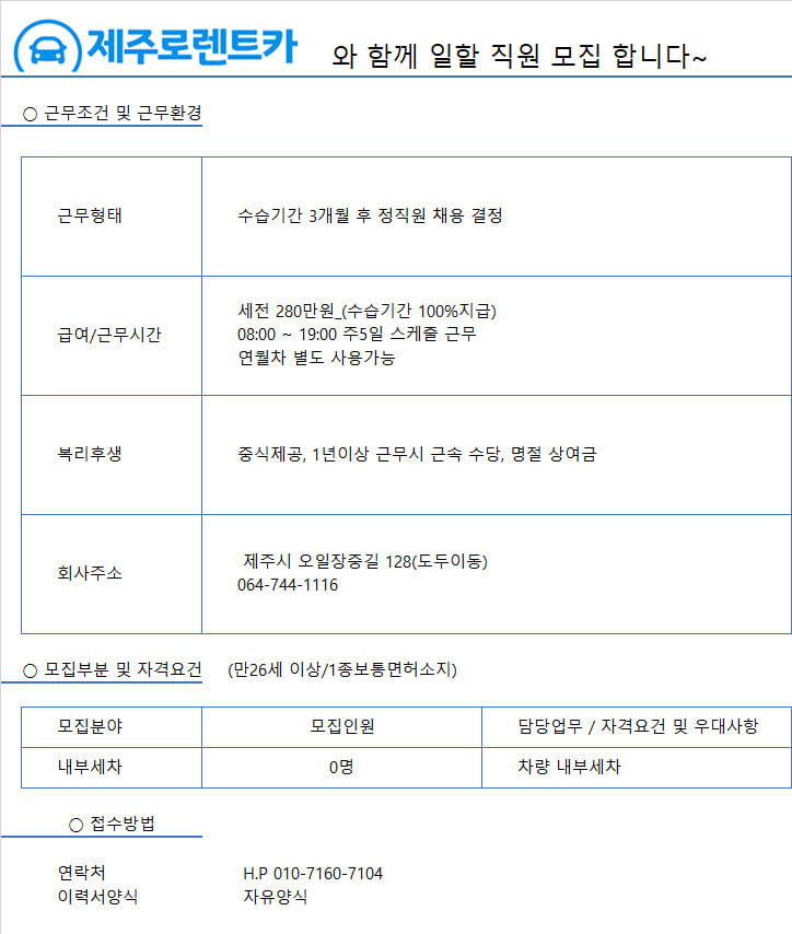 제주로렌트카 내부세차 직원 채용 페이지 정보 작성자 하OOOOO1 작성일24-08-21 20:27 조회3,265회 연락처 010-7160-7104 급여 월급 : 2800000 관련링크 본문 주소 : 제주특별자치도 제주시 오일장중길 128 이전글 다음글 목록