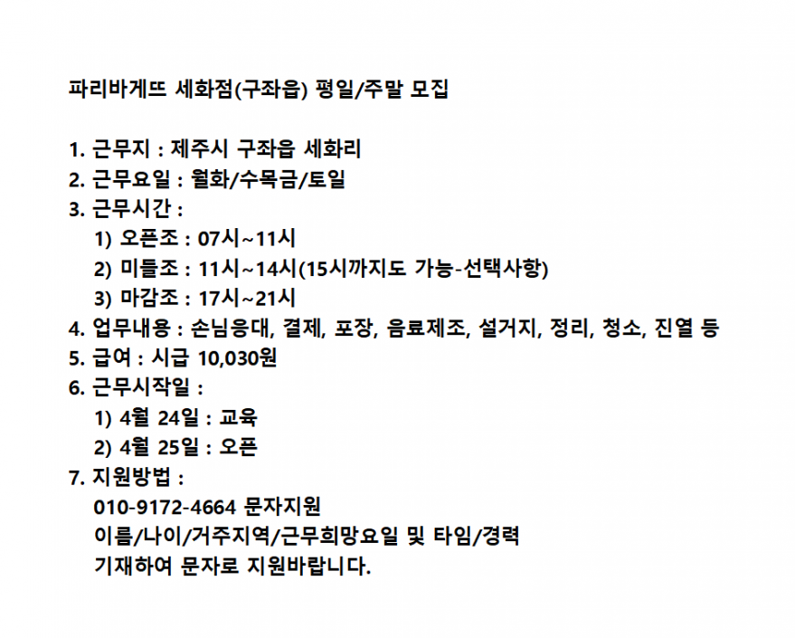 베이커리카페 제주세화(구좌) 평일/주말 알바생 모집 페이지 정보 작성자 또O3 작성일25-04-16 23:14 조회1,870회 연락처 010-9172-4664 급여 시급 : 10030 관련링크 본문 많은 지원바랍니다.감사합니다. 주소 : 제주특별자치도 제주시 구좌읍 일주동로 3126 1층 이전글 다음글 목록