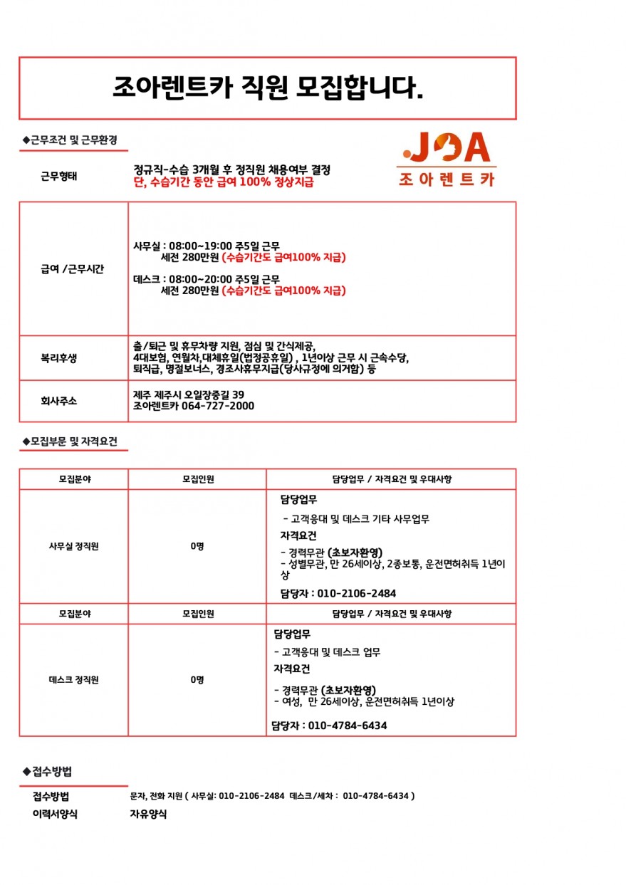 조아렌트카에서 직원을 모집합니다/출퇴근,휴무차량지원/ 페이지 정보 작성자 jOOOOa 작성일24-10-16 09:15 조회3,380회 연락처 010-4784-6434 급여 월급 : 280만원 관련링크 본문 . 주소 : 제주특별자치도 제주시 오일장중길 39 조아렌트카 이전글 다음글 목록