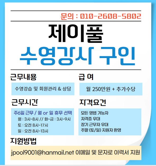 어린이 수영장 강사 정직원 채용공고 페이지 정보 작성자 스O프 작성일24-08-16 10:04 조회3,236회 연락처 010-2608-5802 급여 월급 : 250만원 + @ 관련링크 본문 어린이 수영장 제이풀입니다.아이들과 즐겁게 수영강습 해주실 선생님을 구인합니다아이들에게 수영강습을 하고 싶은 젊은 청년들도 지원 가능합니다.영법 및 강습 교육을 통해 교육기간 이수 후 정직원 채용이 가능합니다. 주소 : 제주특별자치도 제주시 연화남길 22 이전글 다음글 목록