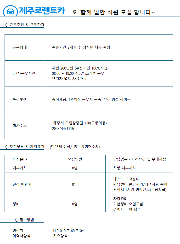 제주로렌트카 직원 모집 페이지 정보 작성자 jOOOOOOOOt 작성일24-09-17 13:10 조회3,499회 연락처 010-7160-7104 급여 월급 : 280만원 관련링크 본문 메세지 부탁드립니다. 주소 : 제주특별자치도 제주시 오일장중길 128 (도두이동) 이전글 다음글 목록