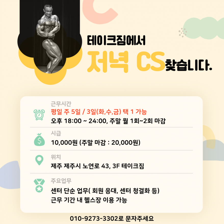 노형 테이크짐에서 아르바이트 구합니다! 직장인, 대학생 가능 페이지 정보 작성자 테OO짐 작성일24-09-12 19:22 조회3,835회 연락처 010-9273-3302 급여 시급 : 만원 관련링크 본문 . 주소 : 제주특별자치도 제주시 노연로 43 3층 테이크짐 이전글 다음글 목록