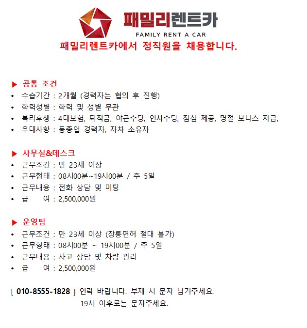 패밀리렌트카 사무실 및 운영팀 직원 구인 페이지 정보 작성자 패OOOO카 작성일24-08-01 17:35 조회3,457회 연락처 010-8555-1828 급여 월급 : 250만 관련링크 본문 연락주세요 주소 : 제주특별자치도 제주시 제성1길 67 패밀리렌트카 이전글 다음글 목록