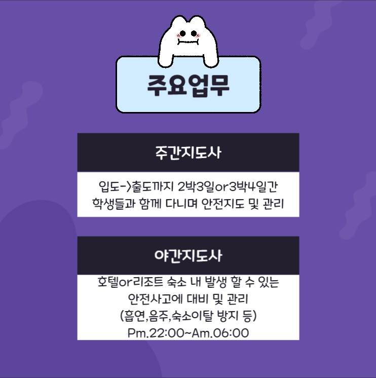학생들 이탈방지 / 외부인통제 / 흡연및음주 등 안전관리 및 통제업무