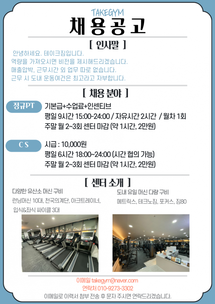 노형 테이크짐에서 저녁 알바, 트레이너 선생님 구인합니다 페이지 정보 작성자 테OO짐 작성일24-09-04 15:15 조회3,881회 연락처 010-9273-3302 급여 시급 : 만원 관련링크 본문 . 주소 : 제주특별자치도 제주시 노연로 43 3층 테이크짐 이전글 다음글 목록
