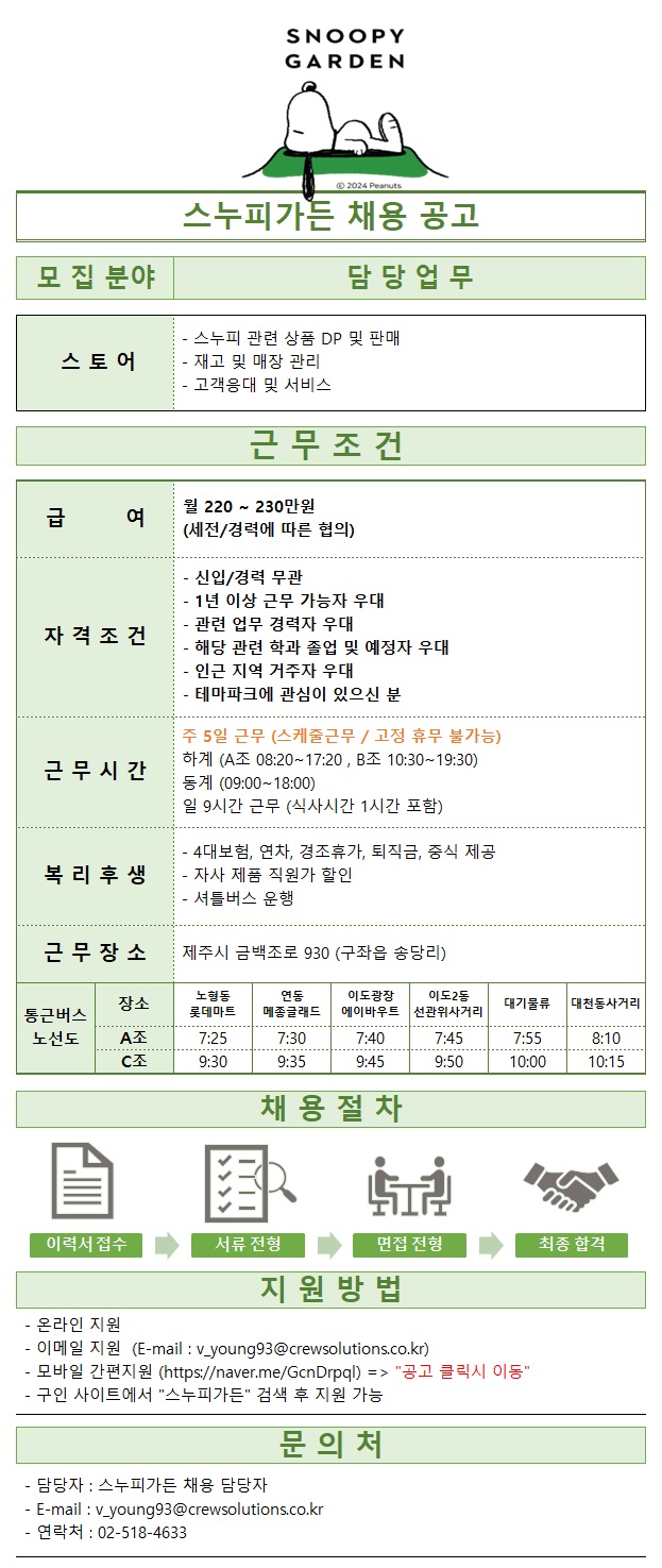 [스누피가든] 스토어(기념품 판매), 레스토랑(주방,조리,요리) 직원 모집 페이지 정보 작성자 스OOO든 작성일24-10-08 09:12 조회3,401회 연락처 010-518-4633 급여 월급 : 220만원 관련링크 본문 간편 지원 홈페이지 : https://naver.me/GcnDrpql알바몬,알바천국 등 구인사이트 지원 가능 주소 : 제주특별자치도 제주시 구좌읍 금백조로 930 이전글 다음글 목록