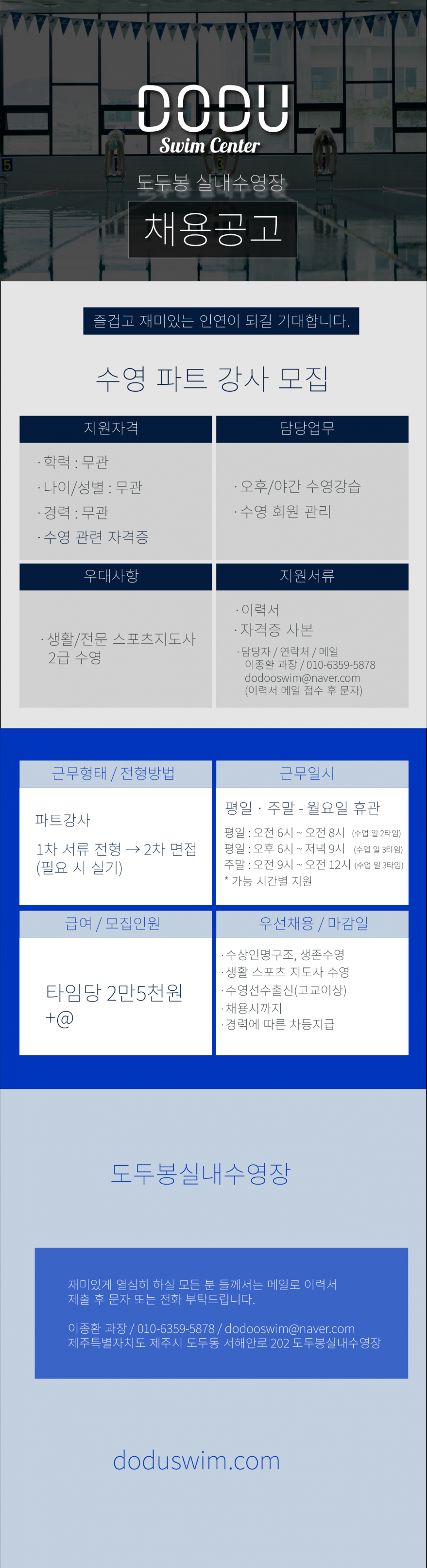 도두봉실내수영장 파트강사 모집 페이지 정보 작성자 도OOOOOO장 작성일25-03-28 07:40 조회1,537회 연락처 010-6359-5878 급여 시급 : 30000 관련링크 본문 ▶전형방법 : 1차 서류전형 → 2차 면접담당자 : 이종환과장연락처 : 010 6359 5878마감일 : 채용 완료 시 까지 - 이력서 메일 접수 / 이력서 자유양식 사용 가능 https://doduswim.com 주소 : 제주특별자치도 제주시 서해안로 202 이전글 다음글 목록