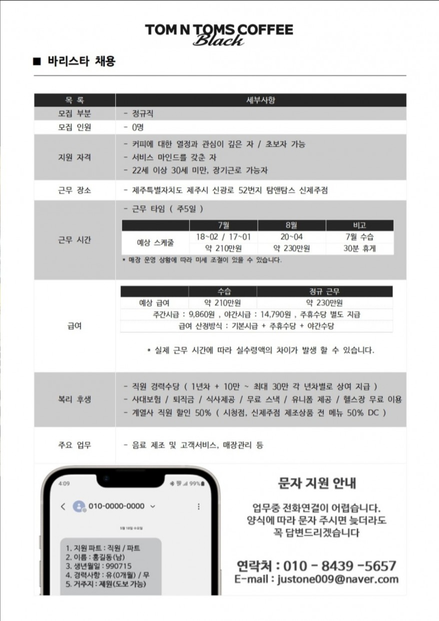 근무일수 : 주 5일 수목금토일 / 월화금토일