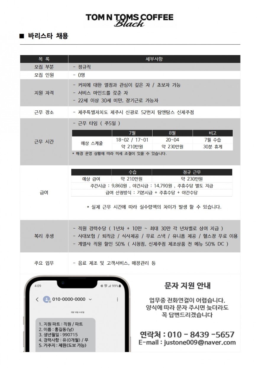 탐앤탐스 제원 주5일 바리스타 구인 페이지 정보 작성자 TOOS 작성일24-07-26 22:59 조회3,429회 연락처 010-8439-5657 급여 월급 : 2,300,000 관련링크 본문 주소 : 제주특별자치도 제주시 신광로 52 밸리스빌딩 1층 탐앤탐스 이전글 다음글 목록