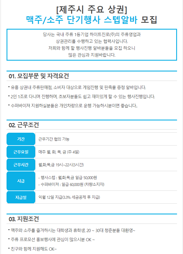 하이트진로 제주지점 주류 스텝 알바 모집합니다 (시청/연동노형) 여 스텝 페이지 정보 작성자 준OO빠 작성일24-07-24 08:54 조회3,489회 연락처 010-9291-9311 급여 일당 : 50000 관련링크 본문 제주시청 1인 노형연동 1인 여성 스텝 구인합니다. 참고 바랍니다. 주소 : 제주특별자치도 제주시 남광로 134 하이트진로 제주지점 이전글 다음글 목록