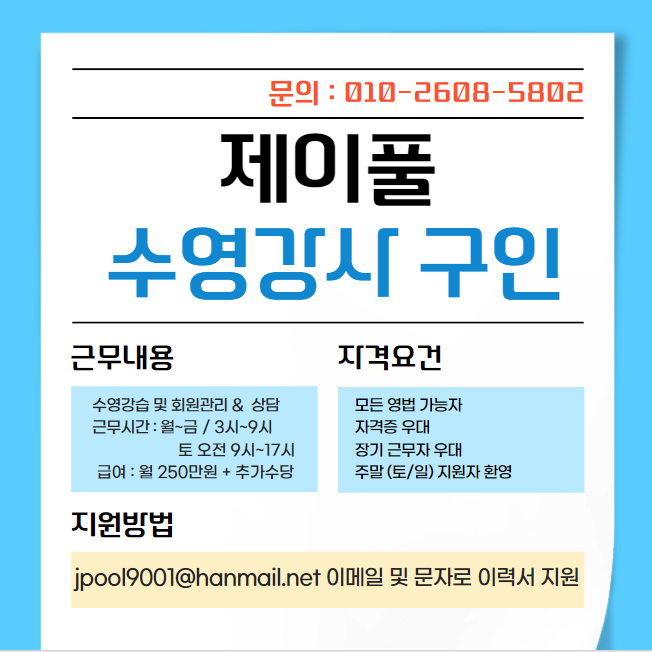 어린이 수영장 강사 정직원 채용 공고 페이지 정보 작성자 스O프 작성일24-10-02 18:19 조회3,714회 연락처 010-2608-5802 급여 월급 : 250만원 + @ 관련링크 본문 어린이 수영장 제이풀입니다.아이들과 즐겁게 수영강습 해주실 선생님을 구인합니다아이들에게 수영강습을 하고 싶은 젊은 청년들도 지원 가능합니다.영법 및 강습 교육을 통해 교육기간 이수 후 정직원 채용이 가능합니다 주소 : 제주특별자치도 제주시 연화남길 22 제이풀2호점 이전글 다음글 목록