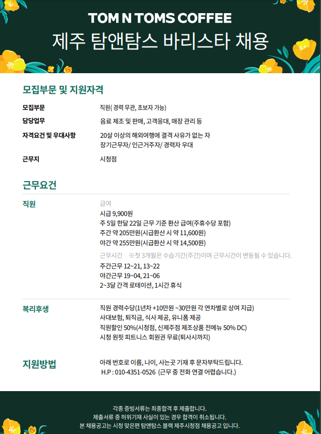 제주시청 탐앤탐스 직원 모집 페이지 정보 작성자 TOOOOOOS 작성일24-09-30 23:19 조회3,610회 연락처 010-4351-0526 급여 시급 : 9900 관련링크 본문 사진참조 주소 : 제주특별자치도 제주시 중앙로 236 문산빌딩 1,2층 이전글 다음글 목록