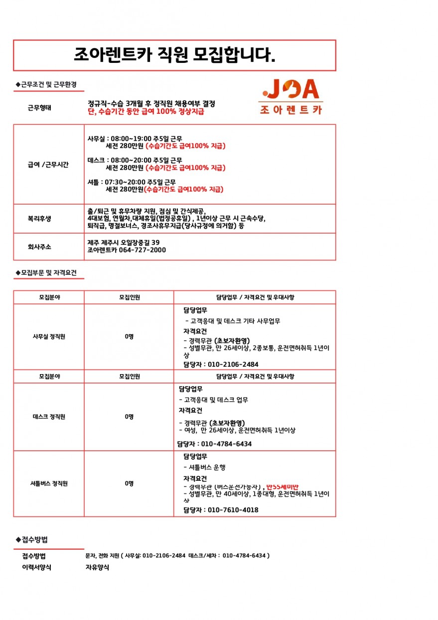 조아렌트카) 직원 모집합니다. / 출퇴근 및 휴무차량 지원 페이지 정보 작성자 쎄OO어 작성일24-07-17 17:06 조회3,575회 연락처 010-4784-6434 급여 월급 : 280만원 관련링크 본문 . 주소 : 제주특별자치도 제주시 오일장중길 39 조아렌트카 이전글 다음글 목록