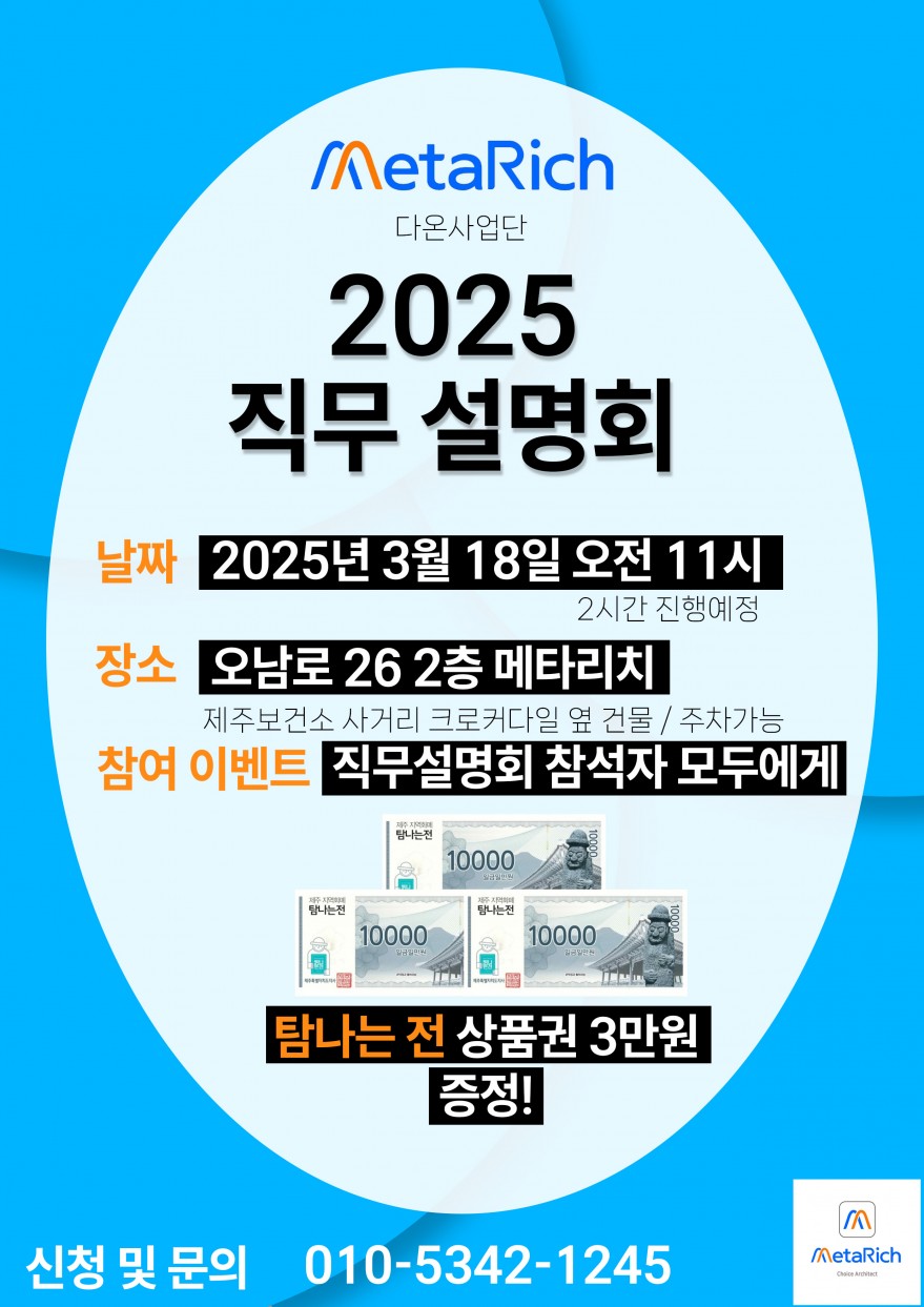 메타리치 직무설명회 참여만 해도 탐나는 전(3만원)+중식 제공 페이지 정보 작성자 메OO온 작성일25-03-14 18:23 조회1,654회 연락처 010-5342-1245 급여 일당 : 30000 관련링크 본문 총 진행시간 2시간입니다.탐나는 전 3만원과 점심 제공됩니다. 주말에도 참가 연락 받습니다. 주소 : 제주특별자치도 제주시 오남로 26 2층메타리치 이전글 다음글 목록