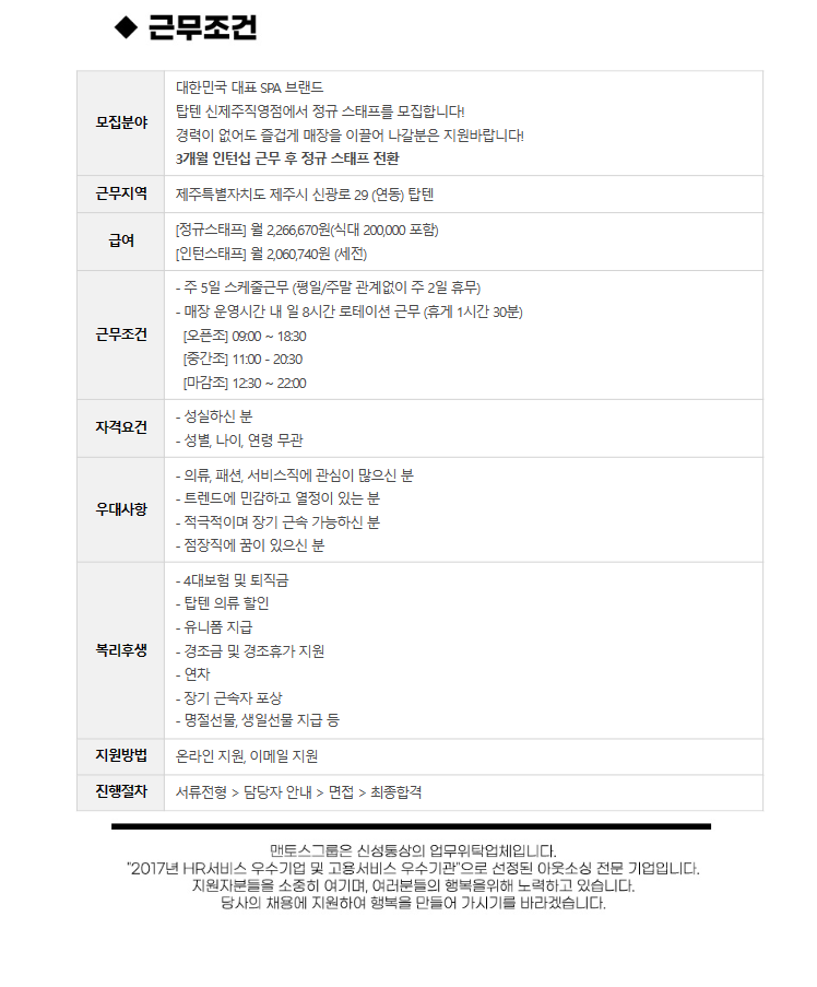 탑텐 신제주직영점에서 정규스태프 모집합니다