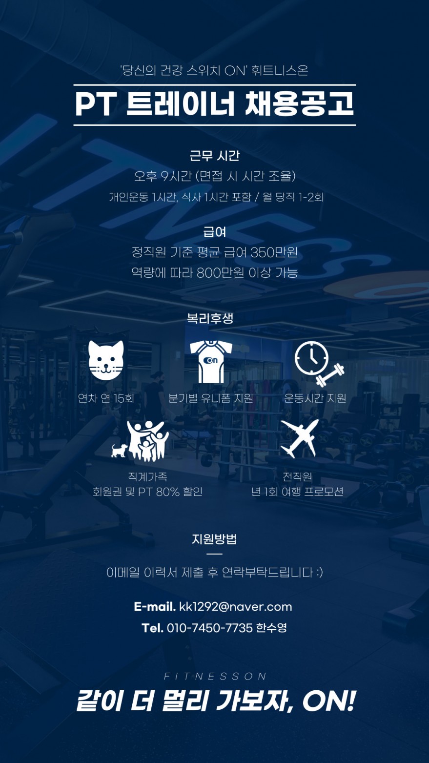 구남동에 위치한 휘트니스온에서 PT 여자 선생님을 구인하고 있습니다