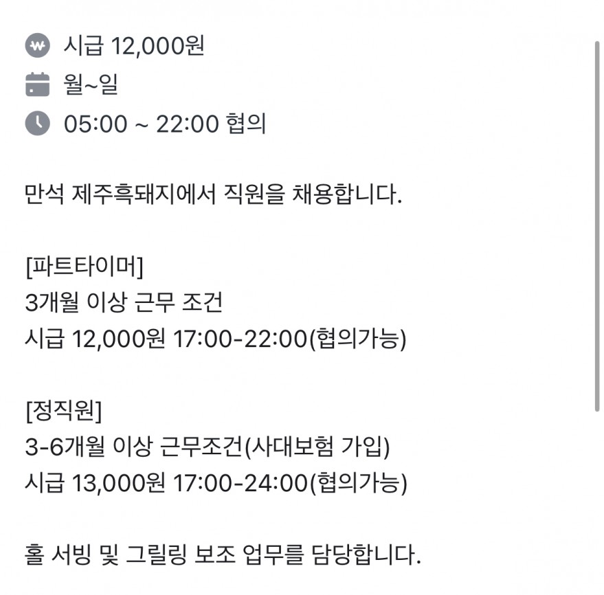 만석 제주흑돼지 홀/주방 직원 및 파트타이머 구인 페이지 정보 작성자 고O진 작성일25-05-08 14:39 조회2,908회 연락처 010-5713-0736 급여 시급 : 13000 관련링크 본문 이미지 파일 참조 주소 : 제주시 원노형 3길 4-6 이전글 다음글 목록