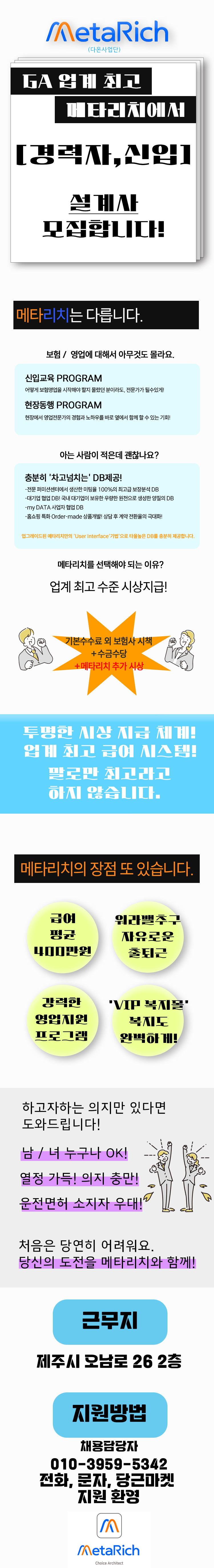 집에 보험 아는 사람은 한명쯤은 있어야죠? 페이지 정보 작성자 메OO온 작성일25-05-07 10:06 조회2,602회 연락처 010-3959-5342 급여 월급 : 4000000 관련링크 본문 언제든지 연락주세요! 직업에 대해 궁금하시면 직무설명회 먼저 신청하셔도 됩니다. 주소 : 제주특별자치도 제주시 오남로 26 2층 이전글 다음글 목록
