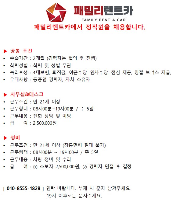 ★패밀리렌트카 사무실 마지막 직원 구인 페이지 정보 작성자 패OOOO카 작성일24-06-18 12:05 조회4,765회 연락처 010-8555-1828 급여 월급 : 250만 관련링크 본문 연락주세요. 주소 : 제주특별자치도 제주시 제성1길 67 패밀리렌트카 이전글 다음글 목록