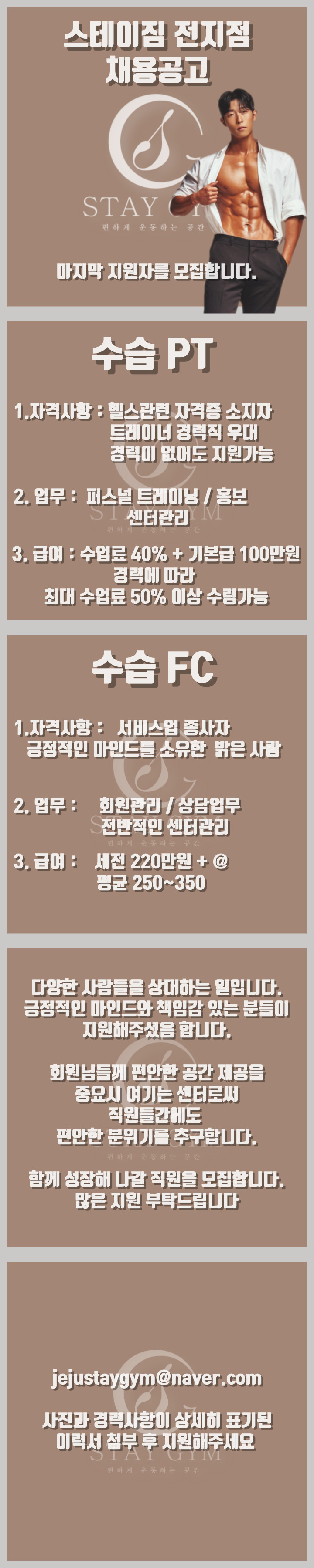 스테이짐과 함께 성장하실 직원을 구합니다 페이지 정보 작성자 스OO짐 작성일24-06-11 22:44 조회3,976회 연락처 010-2936-1403 급여 협의 : 4000000 관련링크 본문 이메일로 이력서 지원 부탁드립니다. 많은 지원 바랍니다. 주소 : 제주특별자치도 제주시 연삼로 121 에스포아 스테이짐 이전글 다음글 목록