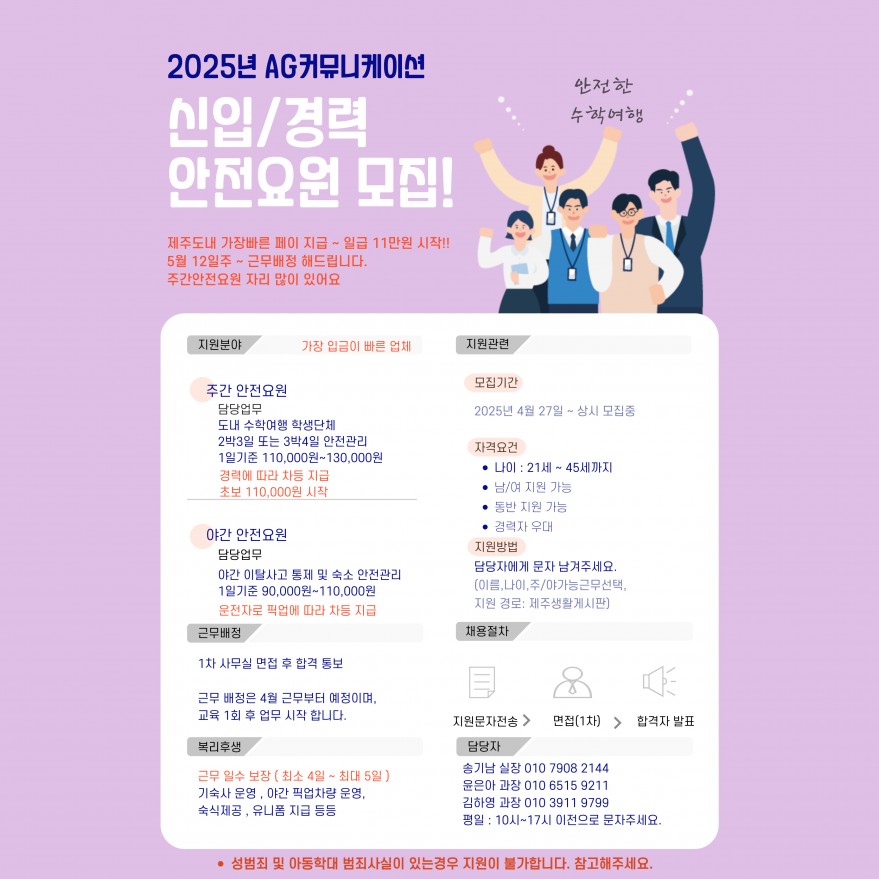 25년 5월 제주 수학여행 안전요원 모집합니다. 페이지 정보 작성자 AOOOOOOOO솔 작성일25-04-27 12:03 조회2,501회 연락처 010-7908-2144 급여 주급 : 110000 관련링크 본문 25년 5월 12일주 근무자 배정 중입니다.빠른 지원이 일수를 보장합니다. 자세한 내용은 담당자에게 문자 이후 확인 부탁 드립니다. 주소 : 제주특별자치도 제주시 도두항서7길 7 1층 101호 이전글 다음글 목록