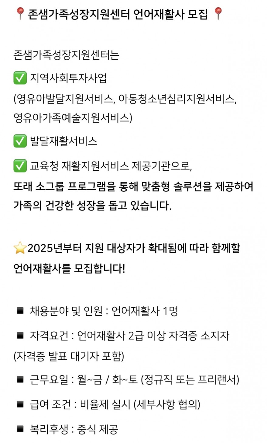 - 자격요건 : 언어재활사 2급 이상 자격증 소지자 (자격증 발표 대기자 포함)