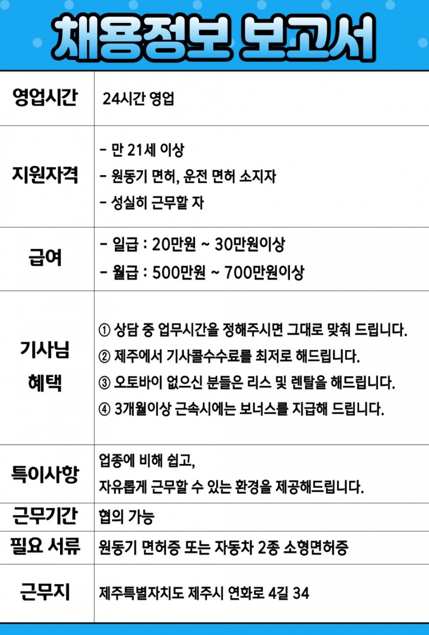 - 우대사항 : 퀵 및 배달대행 경력자, 원동기 소지자