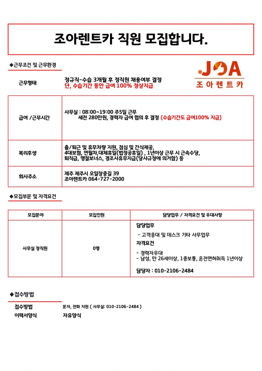조아렌트카) 예약실 직원을 모집합니다. / 출퇴근 및 휴무차량 지원 페이지 정보 작성자 jOOOOa 작성일24-05-21 09:07 조회5,041회 연락처 010-2106-2484 급여 월급 : 280만원 관련링크 본문 . 주소 : 제주특별자치도 제주시 오일장중길 39 조아렌트카 이전글 다음글 목록
