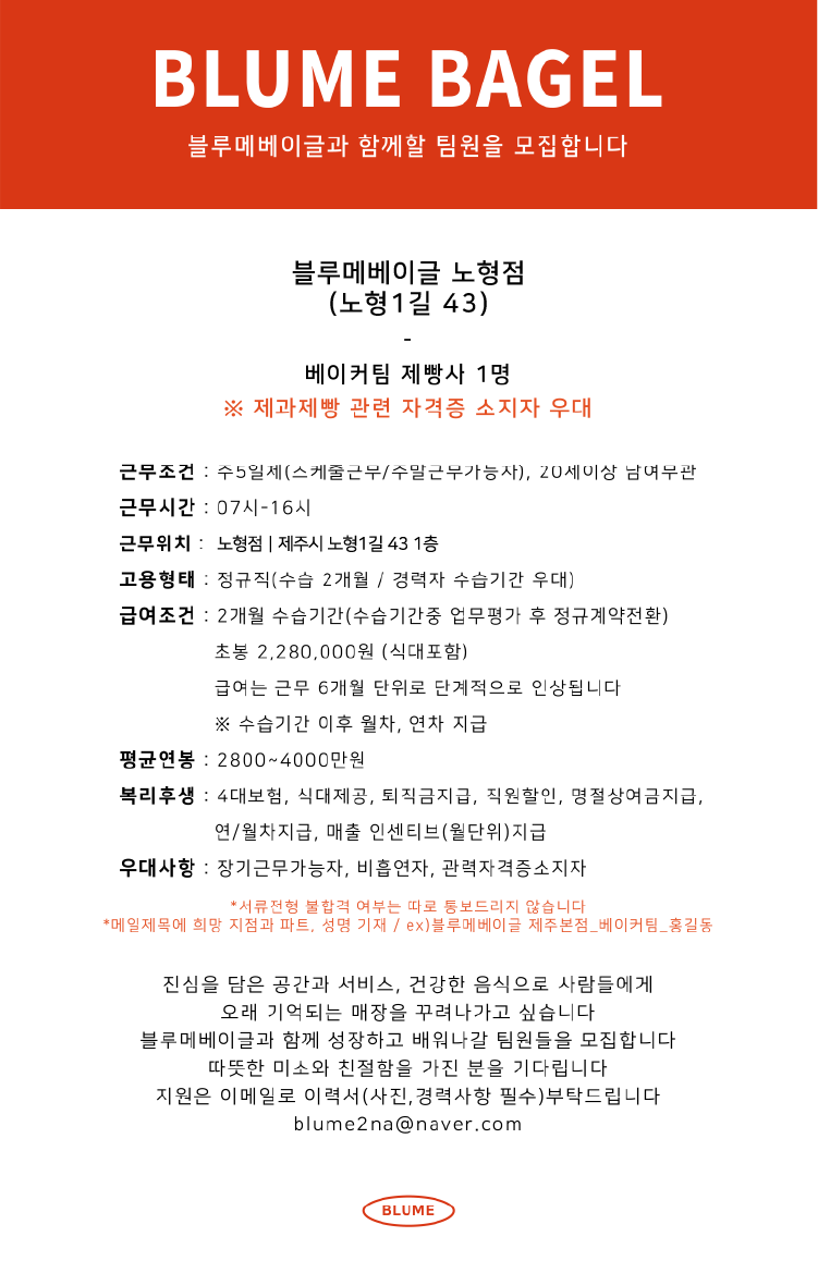 블루메베이글 노형점에서 함께할 제빵사를 구인합니다:) (관련자격증필수) 페이지 정보 작성자 블OOOO글 작성일25-02-11 11:05 조회1,438회 연락처 010-4419-4343 급여 협의 : 0 관련링크 본문 이력서는 이메일로 부탁드립니다. blume2na@naver.com 주소 : 제주특별자치도 제주시 노형1길 43 1층 이전글 다음글 목록