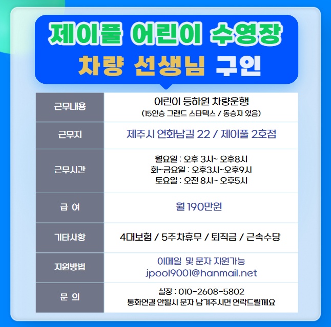 <제이풀> 차량운행 선생님 구인 페이지 정보 작성자 스O프 작성일24-05-19 10:35 조회4,728회 연락처 010-2608-5802 급여 월급 : 190만원 관련링크 본문 어린이 수영장 < 제이풀> 입니다.아이들 등하원시 안전하게 운행해주실 선생님 구인합니다. (차량 동승자 따로 있음) 주소 : 제주특별자치도 제주시 연화남길 22 이전글 다음글 목록