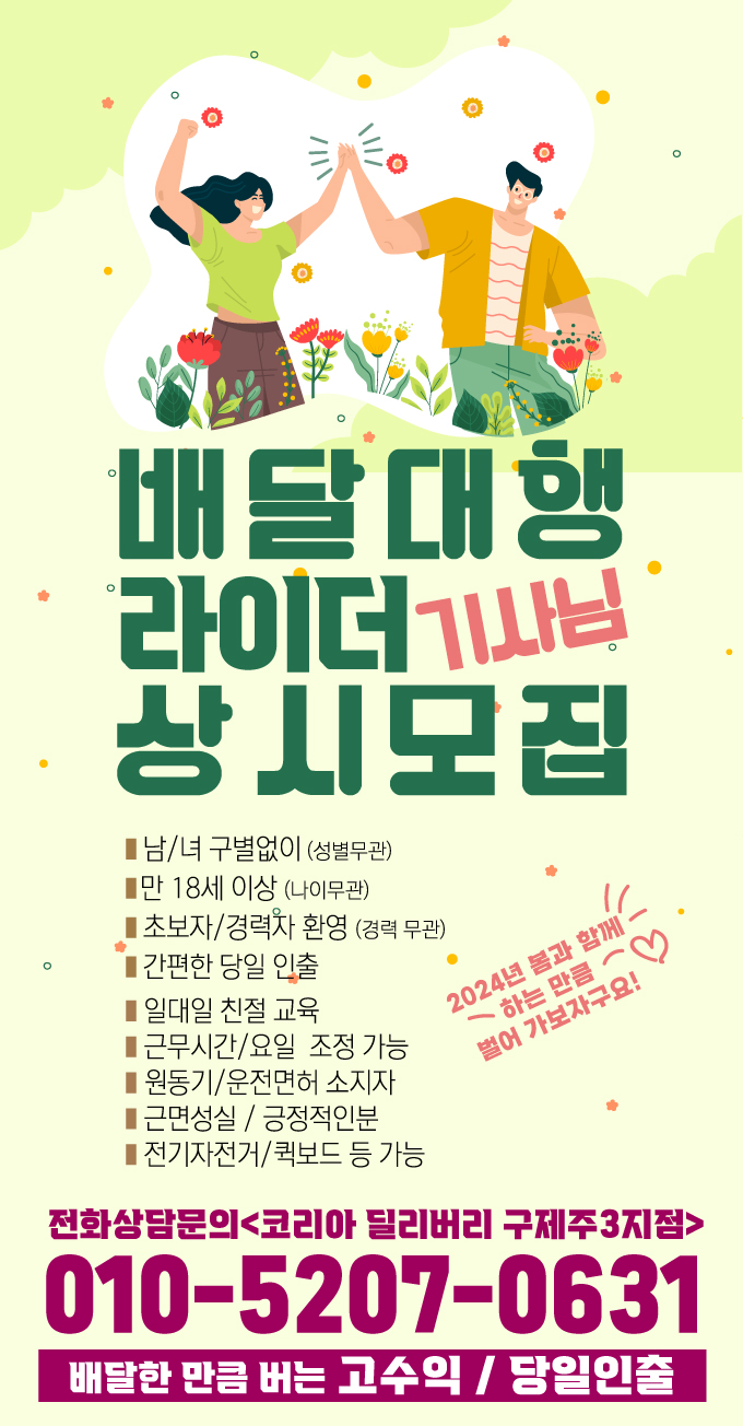 [구제주] 에서 함께 배달일 할 기사님 모집합니다.