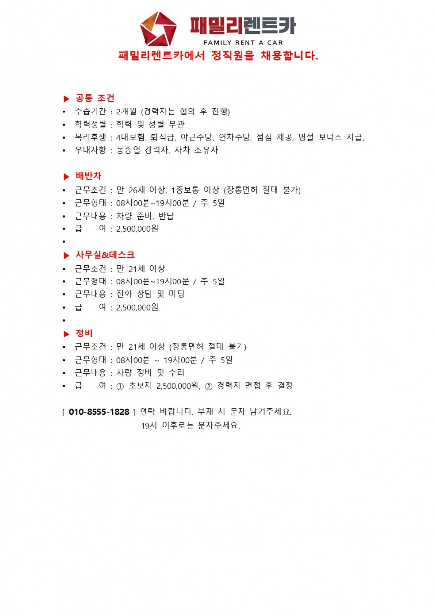패밀리 렌트카에서 함께일할직원모집합니다. 페이지 정보 작성자 제OOOOOO카 작성일24-05-14 10:14 조회6,289회 연락처 010-8555-1828 급여 월급 : 250만원 관련링크 본문 연락부탁드립니다. 주소 : 제주특별자치도 제주시 제성1길 67 패밀리 렌트카 이전글 다음글 목록