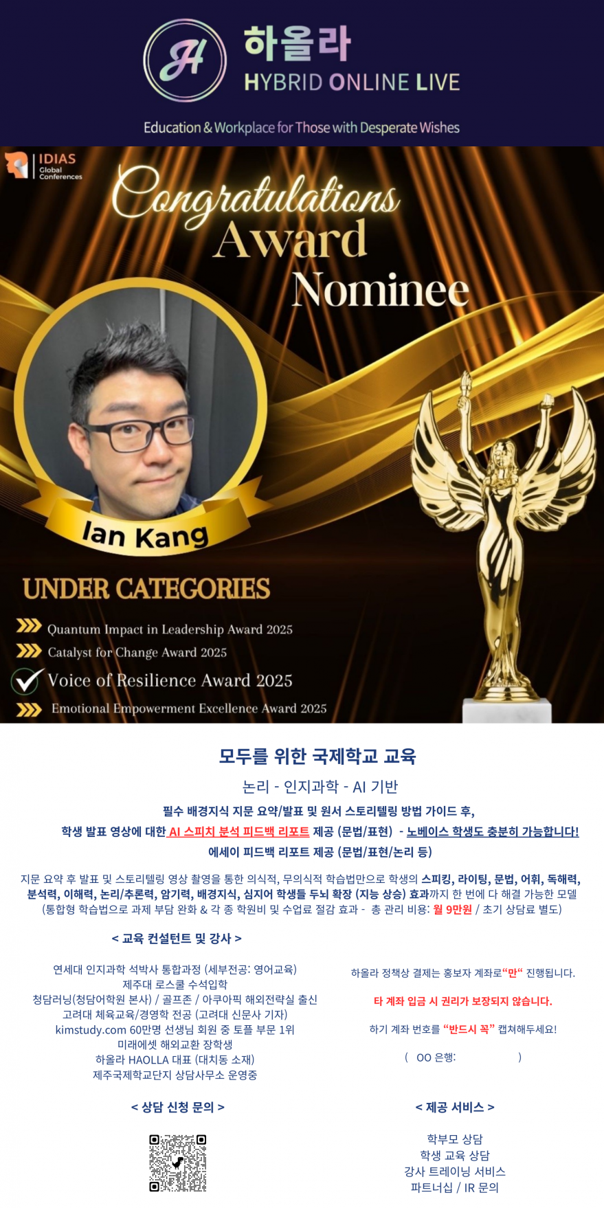 하올라는 논리·인지과학·AI 기반 국제학교식 교육 모델을 제공하며, 학생의 각 종 발표 영상에 대한 AI 스피치 분석 리포트와 에세이 피드백 리포트 제공을 통해 차별화된 교육 서비스를 운영하고 있습니다.