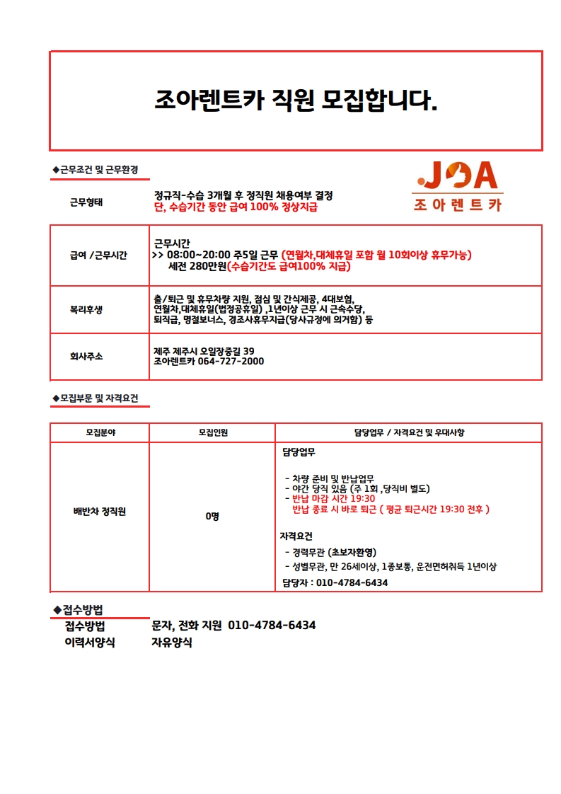 ✧*.◟(ˊᗨˋ)◞.*✧ 조아렌트카 / 출퇴근,휴무차량지원 / 배차 정직원 페이지 정보 작성자 쎄OO어 작성일25-10-09 17:13 조회225회 연락처 010-4784-6434 급여 월급 : 280만원 관련링크 본문 주소 : 제주특별자치도 제주시 오일장중길 39 조아렌트카 이전글 다음글 목록