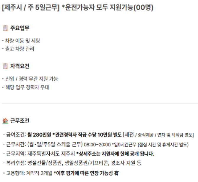 [제주시 / 주 5일근무] *운전가능자 모두 지원가능(00명) 페이지 정보 작성자 동토 작성일25-08-18 10:55 조회555회 연락처 010-3106-0895 급여 월급 : 2,800,000원 관련링크 본문 주소 : 제주특별자치도 제주시 용담이동 2002 제주국제공항 제주시 용문로**(상세주소는 지원자의 한해 공개됩니다) 이전글 다음글 목록