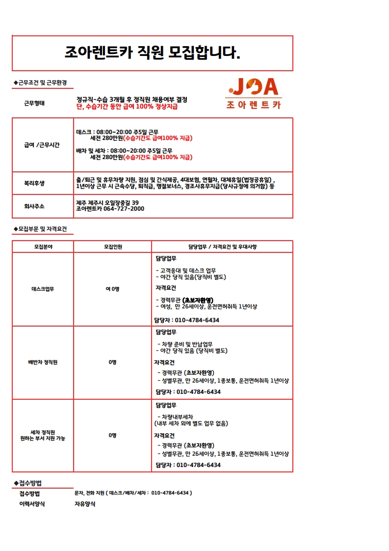 ❤️❤️조아렌트카에서 배차,세차,데스크 정직원을 모집합니다/출퇴근,휴무차량지원 페이지 정보 작성자 jOOOOOt 작성일25-07-28 13:00 조회978회 연락처 010-4784-6434 급여 월급 : 280만원 관련링크 본문 . 주소 : 제주특별자치도 제주시 오일장중길 39 조아렌트카 이전글 다음글 목록