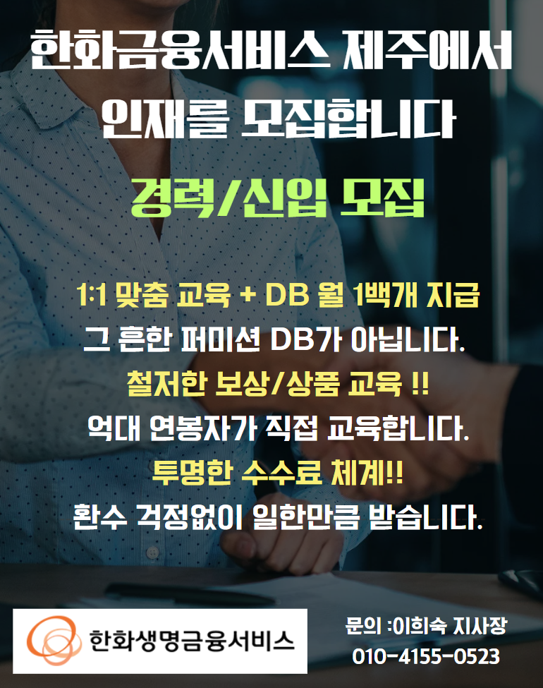 제주지역 신규 오픈 / 매월 100건 고객 리스트 무상 제공 / 평균 급여 800만 원 (현재 기준)